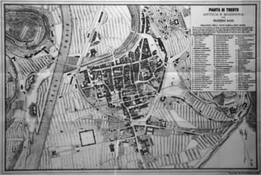 | Keywords: Trento-Francesco Ranzi-Pianta di Trento Antica e Moderna.png en Trento Italy Francesco Ranzi January 28 1826 - April 16 1882 Pianta di Trento Antica e Moderna Map of Ancient and Modern Trento from an anastatic reprint of Francesco Ranzi Pianta Antica della Città di Trento Osservazioni e memorie di Francesco Ranzi imprenditore 1869 G B Monauni The anastatic reprint is again by editor G B Monauni 1975 it Trento Italia Francesco Ranzi 28 gennaio 1826 - 16 Aprile 1882 Pianta di Trento Antica e Moderna da una ristampa anastatica di Francesco Ranzi Pianta Antica della Città di Trento Osservazioni e memorie di Francesco Ranzi imprenditore 1869 G B Monauni La ristampa anastatica è ancora dell'editore G B Monauni 1975 A 1975 anastatic reprint by editor G B Monauni of Francesco Ranzi Pianta Antica della Città di Trento Osservazioni e memorie di Francesco Ranzi imprenditore 1869 G B Monauni A full scan of the original book with this map folded at the end is available at http //books google com/books id Pb0-AAAAcAAJ Google books Francesco Ranzi January 28 1826 - April 16 1882 scan by Matteo Ianeselli 2010-03-07 Old maps of Trento Photos by User Ianezz Taken with Panasonic Lumix DMC-FZ28 1869 PD-old ImageNote 1 1340 1076 102 105 3602 2422 2 Santa Maria Maggiore ImageNoteEnd 1 ImageNote 2 1548 1353 144 91 3602 2422 2 Cathedral of Saint Vigilius ImageNoteEnd 2 ImageNote 3 2093 464 243 401 3602 2422 2 Castello del Buonconsiglio ImageNoteEnd 3 ImageNote 4 1945 925 91 81 3602 2422 2 San Pietro ImageNoteEnd 4 ImageNote 5 689 2056 120 127 3602 2422 2 Palazzo delle Albere ImageNoteEnd 5 ImageNote 6 735 647 84 74 3602 2422 2 Sant'Apollinare ImageNoteEnd 6 ImageNote 7 1773 1656 53 63 3602 2422 2 Torrione ImageNoteEnd 7 ImageNote 8 1548 917 148 148 3602 2422 2 Palazzo Thun ImageNoteEnd 8 ImageNote 9 1924 425 53 49 3602 2422 2 Torre Verde ImageNoteEnd 9 ImageNote 10 1579 809 113 98 3602 2422 2 Palazzo Fugger Galasso ImageNoteEnd 10 ImageNote 11 1590 1209 67 46 3602 2422 2 Santissima Annunziata ImageNoteEnd 11 ImageNote 12 1970 1381 84 70 3602 2422 2 Santa Trinità ImageNoteEnd 12 ImageNote 13 1196 914 88 70 3602 2422 2 Torre Vanga ImageNoteEnd 13 ImageNote 14 1629 1262 46 42 3602 2422 2 Torre Civica ImageNoteEnd 14 ImageNote 15 1840 1469 81 56 3602 2422 2 Palazzo Roccabruna ImageNoteEnd 15 ImageNote 16 1801 1090 67 67 3602 2422 2 Palazzo Bortolazzi ImageNoteEnd 16 ImageNote 17 1710 1473 42 74 3602 2422 2 Palazzo Larcher Fogazzaro ImageNoteEnd 17 ImageNote 18 1073 1789 264 239 3602 2422 2 Cimitero Monumentale ImageNoteEnd 18 ImageNote 19 1977 517 63 70 3602 2422 2 Palazzo Trautmannsdorf Saracini ImageNoteEnd 19 ImageNote 20 1453 988 88 81 3602 2422 2 Palazzo Geremia ImageNoteEnd 20 ImageNote 21 1759 1399 67 77 3602 2422 2 Palazzo Sardagna ImageNoteEnd 21 ImageNote 22 1636 1301 39 60 3602 2422 2 Palazzo Pretorio ImageNoteEnd 22 |