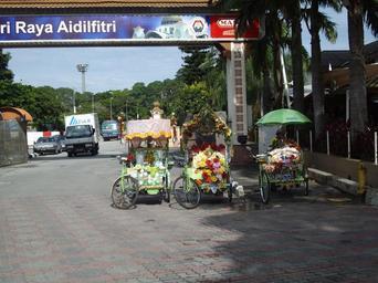Keywords: Tricycle taxis in Melaka.JPG en Human ridden Tricycle Taxi's of Melaka with their famous In-Built music system a popular tourist mode of sightseeing the town Thursday 25-10-2007 own Rudolph A furtado Transportations in Melaka