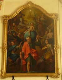 | Keywords: Triembach-au-Val 004.JPG fr Tableau du XVIIIe siècle représentant les 14 Saints intercesseurs own Bernard Chenal 1er janvier 2009 GFDL cc-by-sa-all Artwork / Œuvre d'art / Kunstwerk Artist Les treize saints intercesseurs sont regroupés autour de saint Christophe portant l'enfant Jésus de bas en haut et de la gauche vers la droite saint Georges avec le dragon saint Gilles avec la biche saint Cyriaque avec un glaive saint Blaise avec un cierge saint Erasme avec le cabestan saint Pantaléon avec ses deux mains clouées sur la tête saint Acace avec la croix de sa crucifixion sainte Barbe tenant le ciboire surmonté d'une hostie sainte Catherine tenant une épée saint Denis tenant sa tête saint Eustache avec le cerf saint Gui dans le chaudron et sainte Marguerite oil canvas 210 cm de large Église Saint-Christophe de Triembach-au-Val IM67012883 object history Ce tableau figurant les quatorze saints intercesseurs fut peint durant la seconde moitié du 18e siècle D'après des travaux historiques il aurait été offert par Martin Dollé-Stoss à cette église en 1892 Il a été restauré par un peintre du nom de Weltz vers 1850 ; il s'agit probablement du peintre-doreur installé à Villé Antoine Weltz Le tableau a été restauré en 2000 par C Bernard other versions Bernard Chenal PD-old accession number Interior of Église Saint-Christophe de Triembach-au-Val Baroque church paintings in Alsace 18th-century church paintings in Alsace Church paintings in Bas-Rhin Fourteen Holy Helpers Paintings of Saint Christopher |
