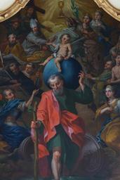 | Keywords: TriembachVal StChristophe 29.JPG Alsace Bas-Rhin Triembach-au-Val Église Saint-Christophe Tableau du XVIIIe siècle représentant les 14 Saints intercesseurs own 2015 Ralph Hammann cc-by-sa-4 0 Taken with Panasonic Lumix DMC-FZ1000 Photographs of Bas-Rhin by Ralph Hammann Artwork / Œuvre d'art / Kunstwerk Artist Les treize saints intercesseurs sont regroupés autour de saint Christophe portant l'enfant Jésus de bas en haut et de la gauche vers la droite saint Georges avec le dragon saint Gilles avec la biche saint Cyriaque avec un glaive saint Blaise avec un cierge saint Erasme avec le cabestan saint Pantaléon avec ses deux mains clouées sur la tête saint Acace avec la croix de sa crucifixion sainte Barbe tenant le ciboire surmonté d'une hostie sainte Catherine tenant une épée saint Denis tenant sa tête saint Eustache avec le cerf saint Gui dans le chaudron et sainte Marguerite oil canvas 210 cm de large Église Saint-Christophe de Triembach-au-Val IM67012883 object history Ce tableau figurant les quatorze saints intercesseurs fut peint durant la seconde moitié du 18e siècle D'après des travaux historiques il aurait été offert par Martin Dollé-Stoss à cette église en 1892 Il a été restauré par un peintre du nom de Weltz vers 1850 ; il s'agit probablement du peintre-doreur installé à Villé Antoine Weltz Le tableau a été restauré en 2000 par C Bernard other versions Bernard Chenal PD-old accession number Interior of Église Saint-Christophe de Triembach-au-Val Church paintings in Bas-Rhin Baroque church paintings in Alsace 18th-century church paintings in Alsace Fourteen Holy Helpers Paintings of Saint Christopher Details of 18th-century paintings |