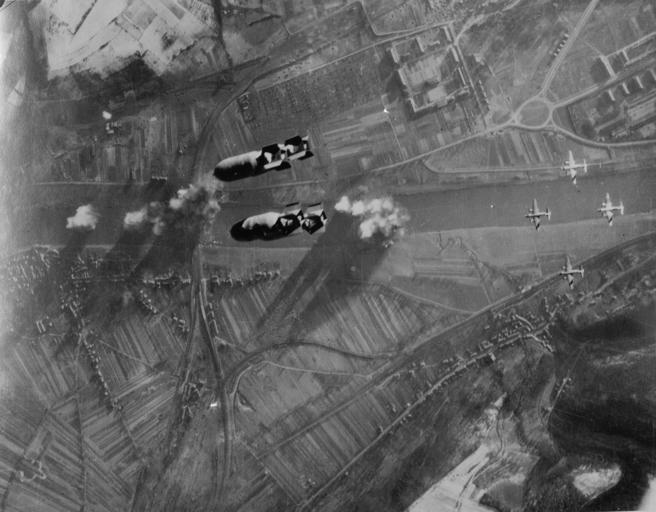 | Keywords: Trier-Pfalzel RR bridge B-26 attack2 1944.jpg de Foto eines Angriffs von Martin B-26 Marauder der USAAF auf die Eisenbahnbrücke über die Mosel in Trier-Pfalzel Vermutlich zeigt das Foto den Angriff vom 24 Dezember 1944 als 69 B-26 der 323 und 394 Bombergruppe die Brücke mit 122 3 t HE-Bomben angriffen Der Angriff erfolgte von 13 30h bis 13 45h Dazu passt die im Süden stehende Sonne sichtbar an den Schatten der Heckleitwerke auf den linken Tragflächen Rechts im Bild sind der Verteilerkreis der Nells Park und die Kasernen an der Dasbachstraße und der Herzogenbuscher Straße zu sehen Unten im Bild liegt rechts Trier-Biewer links Trier-Pfalzel und der Verschiebebahnhof Ehrang Schnee liegt auf den Hügeln en View of an attack of USAAF Martin B-26 Marauder bombers on the railroad bridge across the Moselle river at Trier-Pfalzel Rhineland-Palatinate Germany The photo was probably taken on 24 December 1944 when 69 B-26s of the 323rd and 394th Bomb Group attacked the bridge with 122 3 t of HE bombs The attack took place between 1330 and 1345hrs and the sun in the south throws the shadows of the tail fins on the left wings of the B-26s On the right bank of the Moselle are the Verteilerkreis roundabaout Nell's Park and the barracks on Dasbach St and Herzogenbuscher St On the left bank are Trier-Biewer right and Trier-Pfalzel left and the Ehrang rail yard Snow is visible on the hills LOC-image fsa 8e02757 1944-12-24 USAAF frame removed 49 77768 6 68368 PD-USGov World War II aerial photographs of Trier Martin B-26 Marauder Ehrang Trier-Pfalzel Pfalzel railway bridge Trier Bombing of Trier in World War II 1944 in Trier World War II in December 1944 Photographs taken on 1944-12-24 394th Bombardment Group United States Army Air Forces |