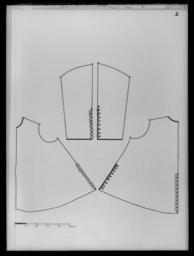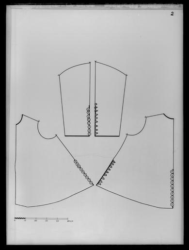 | Keywords: Tröja av sämskskinn. Förmodligen tillverkad av Jehan Beranger, Stockholm - Livrustkammaren - 34481.tif LSH artwork Friderich Feuerbrun pärlstickare Jehan Johan Beranger brodör sv Tröjan av sämskat skinn som tydligen parfymerats av s k innocenttyp med svängd midjelinje 10 skört ståndkrage och relativt korta ärmar med öppna sömmar framtill På grund av det ganska stela och styva materialet eller av att man begagnat sig av ett något urvuxet plagg har man försett det med diverse kilar och tillskarvade stycken Tydligen har man broderat de tillskurna bitarna innan de sedan fogats samman Broderiet är av något annan karaktär än kasackens och byxornas som däremot sinsemellan förefalla likartade I tröjan kan man spåra mer av stramhet Broderiet har sytts icke blott genom lädret utan också genom ett relativt grovt lärftsfoder 17x17 tr/cm2 som lagts mot lädrets insida <br/>Broderiet utgörs även här av en bård Den upptar egentligen ett strängt stiliserat mönster av 16 cm höjd och har nertill vid ytterkanterna begränsats av en repstav och härovanför av en bård som innehåller delar av vad man skulle vilja kalla lambrequinmotiv lagt med repstav Ovanför denna bård följer kompositioner med fruktkorgsmotiv samt palmettarrangering helt symmetriska Allra överst komma dock tulpanliknande blommor som böja sig varannan gång åt höger varannan gång åt vänster Rakt ovanför lambrequinmotivet sitter en liten symmetrisk 7-bladig palmett <br/>Anmärkningsvärt är att man tydligen på tröjan sedan de broderade läderstyckena monterats broderat små kantiljer utanför sömmen d v s i mönstrets fortsättning på det andra läderstycket På ärmarna har man t o m broderat ett ca 4 á 5 cm brett parti i något klumpigare utförande på det nedersta ärmstycket Här kan observeras att man genomgående glömt att göra stycket spegelvänt i förhållande till den intilliggande fruktkorgen Mönstret är för övrigt otroligt väl anpassat till bårdens bredd så att dess proportioner växla på det mest följsamma sätt Lädrets sömmar är hopkastade från baksidan med ca 6stygn/cm samt åt motsatt håll med ca 2 långa kaststygn sytt med 2-trådig högertvinnad grå lintråd I själva broderiet som sytts genom läder och linnefoder har man t ex tagit 9 stygn på en sträcka av 1 cm längd när man sytt ner paljettsträngen Man har använt olikfärgat silke grått gult brunt - med mellannyanser - samt rosa och halmgult <br/>Ett speciellt påpekande bör göras angående skörtens broderier Här har man nämligen förminskat mönstret till mindre rapport och endast broderat små blommor och ornament men likväl behållit lambrequinbården som även den förminskats Man kan lägga märke till delsatt när den 4 5 cm breda spetsen som sytts på skörtens 3 fria sidor denna sitter så långt in på broderiet att lambrequinbården helt döljs dels att man genomgående klippt fodertyget brokaden på baksidan något större än det broderade läderskörtet Dessutom har man på vänstra sidans främsta skört klippt av dess bakre sida vertikalt mitt i broderiet - man har tydligen från början broderat på ett alltför stort skörtstycke Blott en del skört har fått det yttersta snoddbandet som ingår i dekoren placerat på de 3 yttersidorna <br/>Kragen har broderier endast på höger sida ca 9 cm från framkanten räknat På vänster sida går däremot dessa ej ut från kanten utan ca 1 5 cm därifrån och omkring 8 cm åt sidan Det är en ståndkrage med ett 60-tal vertikala avsyningar över de 2 i det grova lärftsfodret 19x18 tr/cm2 horisontellt inlagda lång fiskbenen Dess söm bak ligger inte helt i mitten utan någon cm mer åt höger Upptill är den kantad med ett numera mycket trasigt grått ripsband och har haft vitt taftfoder på insidan Längs den raka framkanten knäpps tröjan med 22 st knappar ca 1 2 cm i diameter varav den 6 e uppifrån saknas Dessutom finns i ståndkragen 3 knappar av samma sort och lika många tränsar av guld- och silvertråd Ärmarna saknar nertill vid uppslagen knappar och knapphål och skiljer sig härigenom från flertalet tröjor <br/>På det högra framstycket där knapparna sitter finns en ca 4 5 cm bred knypplad guld- och silverspets med inlagda breda silverlan som nedifrån skörtets yttersta spets och uppåt räknat når till en höjd av 25 cm Härovanför vidtar en betydligt smalare spets blott 2 8cm bred Detta arrangemang verkar vara ursprungligt då man kan finna liknande tillvägagångssätt på andra tröjor På den knapphålsförsedda vänstra sidan saknas spets helt Placeringen av den breda spetsen tyder på att plagget blott skulle vara knäppt t o m det 12 e eller 13 e knapphålet uppifrån räknat Numera kan man göra den iakttagelsen att just dessa knapphål slitits vilket visserligen även skett med det 20 e som dock kantänkas härröra från tidigare utställning <br/>I övrigt har den breda spetsen tydligen suttit runt omkring alla skört Varje skört drar ca 40 cm vid de öppna ärmsömmarna i de öppna ärmuppslagens insidor runt ärmsömmarna på axelsömmarna och 38 cm på vänster framstycke och eventuellt även på kragen Numera finns spetsarna uteslutande kvar på 1 a skörtet på höger sida skörten mitt bak samt det 3 e på vänster sida i bägge ärmarnas långa sprund i ärmuppslaget på vänster ärm runt höger ärm samt vid nedre delen av vänster ärmringning på höger axel och den redan nämnda biten på höger framstycke I midjesömmen under skörten sitter på insidan 6 st byxtampar försedda med vardera 2 hål Den mellersta på höger sida är troligen senare ditsydd eftersom den är klädd med en glesare vävnad med mörkare guldlan De övriga är - som brukligt är - sydda av foderbrokaden <br/>Tröjan är fodrad med s k gyllenduk d v s guldbrokad Den har en vådbredd av minst 50 cm utan stad ca 70x20 tr/cm2 med varp av otvinnat vitt silke Inslaget bildas av tjockare vitt silke med sil