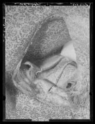 | Keywords: Tröja av sämskskinn. Förmodligen tillverkad av Jehan Beranger, Stockholm - Livrustkammaren - 11169.tif LSH artwork Friderich Feuerbrun pärlstickare Jehan Johan Beranger brodör sv Tröjan av sämskat skinn som tydligen parfymerats av s k innocenttyp med svängd midjelinje 10 skört ståndkrage och relativt korta ärmar med öppna sömmar framtill På grund av det ganska stela och styva materialet eller av att man begagnat sig av ett något urvuxet plagg har man försett det med diverse kilar och tillskarvade stycken Tydligen har man broderat de tillskurna bitarna innan de sedan fogats samman Broderiet är av något annan karaktär än kasackens och byxornas som däremot sinsemellan förefalla likartade I tröjan kan man spåra mer av stramhet Broderiet har sytts icke blott genom lädret utan också genom ett relativt grovt lärftsfoder 17x17 tr/cm2 som lagts mot lädrets insida Broderiet utgörs även här av en bård Den upptar egentligen ett strängt stiliserat mönster av 16 cm höjd och har nertill vid ytterkanterna begränsats av en repstav och härovanför av en bård som innehåller delar av vad man skulle vilja kalla lambrequinmotiv lagt med repstav Ovanför denna bård följer kompositioner med fruktkorgsmotiv samt palmettarrangering helt symmetriska Allra överst komma dock tulpanliknande blommor som böja sig varannan gång åt höger varannan gång åt vänster Rakt ovanför lambrequinmotivet sitter en liten symmetrisk 7-bladig palmett Anmärkningsvärt är att man tydligen på tröjan sedan de broderade läderstyckena monterats broderat små kantiljer utanför sömmen d v s i mönstrets fortsättning på det andra läderstycket På ärmarna har man t o m broderat ett ca 4 á 5 cm brett parti i något klumpigare utförande på det nedersta ärmstycket Här kan observeras att man genomgående glömt att göra stycket spegelvänt i förhållande till den intilliggande fruktkorgen Mönstret är för övrigt otroligt väl anpassat till bårdens bredd så att dess proportioner växla på det mest följsamma sätt Lädrets sömmar är hopkastade från baksidan med ca 6stygn/cm samt åt motsatt håll med ca 2 långa kaststygn sytt med 2-trådig högertvinnad grå lintråd I själva broderiet som sytts genom läder och linnefoder har man t ex tagit 9 stygn på en sträcka av 1 cm längd när man sytt ner paljettsträngen Man har använt olikfärgat silke grått gult brunt - med mellannyanser - samt rosa och halmgult Ett speciellt påpekande bör göras angående skörtens broderier Här har man nämligen förminskat mönstret till mindre rapport och endast broderat små blommor och ornament men likväl behållit lambrequinbården som även den förminskats Man kan lägga märke till delsatt när den 4 5 cm breda spetsen som sytts på skörtens 3 fria sidor denna sitter så långt in på broderiet att lambrequinbården helt döljs dels att man genomgående klippt fodertyget brokaden på baksidan något större än det broderade läderskörtet Dessutom har man på vänstra sidans främsta skört klippt av dess bakre sida vertikalt mitt i broderiet - man har tydligen från början broderat på ett alltför stort skörtstycke Blott en del skört har fått det yttersta snoddbandet som ingår i dekoren placerat på de 3 yttersidorna Kragen har broderier endast på höger sida ca 9 cm från framkanten räknat På vänster sida går däremot dessa ej ut från kanten utan ca 1 5 cm därifrån och omkring 8 cm åt sidan Det är en ståndkrage med ett 60-tal vertikala avsyningar över de 2 i det grova lärftsfodret 19x18 tr/cm2 horisontellt inlagda lång fiskbenen Dess söm bak ligger inte helt i mitten utan någon cm mer åt höger Upptill är den kantad med ett numera mycket trasigt grått ripsband och har haft vitt taftfoder på insidan Längs den raka framkanten knäpps tröjan med 22 st knappar ca 1 2 cm i diameter varav den 6 e uppifrån saknas Dessutom finns i ståndkragen 3 knappar av samma sort och lika många tränsar av guld- och silvertråd Ärmarna saknar nertill vid uppslagen knappar och knapphål och skiljer sig härigenom från flertalet tröjor På det högra framstycket där knapparna sitter finns en ca 4 5 cm bred knypplad guld- och silverspets med inlagda breda silverlan som nedifrån skörtets yttersta spets och uppåt räknat når till en höjd av 25 cm Härovanför vidtar en betydligt smalare spets blott 2 8cm bred Detta arrangemang verkar vara ursprungligt då man kan finna liknande tillvägagångssätt på andra tröjor På den knapphålsförsedda vänstra sidan saknas spets helt Placeringen av den breda spetsen tyder på att plagget blott skulle vara knäppt t o m det 12 e eller 13 e knapphålet uppifrån räknat Numera kan man göra den iakttagelsen att just dessa knapphål slitits vilket visserligen även skett med det 20 e som dock kantänkas härröra från tidigare utställning I övrigt har den breda spetsen tydligen suttit runt omkring alla skört Varje skört drar ca 40 cm vid de öppna ärmsömmarna i de öppna ärmuppslagens insidor runt ärmsömmarna på axelsömmarna och 38 cm på vänster framstycke och eventuellt även på kragen Numera finns spetsarna uteslutande kvar på 1 a skörtet på höger sida skörten mitt bak samt det 3 e på vänster sida i bägge ärmarnas långa sprund i ärmuppslaget på vänster ärm runt höger ärm samt vid nedre delen av vänster ärmringning på höger axel och den redan nämnda biten på höger framstycke I midjesömmen under skörten sitter på insidan 6 st byxtampar försedda med vardera 2 hål Den mellersta på höger sida är troligen senare ditsydd eftersom den är klädd med en glesare vävnad med mörkare guldlan De övriga är - som brukligt är - sydda av foderbrokaden Tröjan är fodrad med s k gyllenduk d v s guldbrokad Den har en vådbredd av minst 50 cm utan stad ca 70x20 tr/cm2 med varp av otvinnat vitt silke Inslaget bildas av tjockare vitt silke med silverlan på rätan i varje inslag sa
