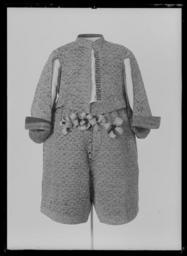 | Keywords: Tröja av svart atlas, 1650-tal - Livrustkammaren - 10306.tif LSH artwork Friderich Feuerbrun pärlstickare David Pärlestickare pärlstickare sv Detta är en dräkt som man mycket gärna skulle vilja sätta i samband med Karl X Gustavs kröning men det finns ännu inget dokumentariskt bevis för detta dräkten ingår ev i fransyska varorna Det är en synnerligen rikt utstyrd dräkt och den har såväl i sitt broderi som i sin foder brokad en ovanligt hög guldhalt I 1671 års inventarium sägs det att dräkten utgörs av kappa tröja byxor knäband skorosor och handskar Allt av svart atlas med Gull heelöfwer borderat Numera är tyvärr dräkten inte längre så fullständig både 1671 och 1676 års inventarier vittnar visserligen om kappans existens men därefter är den försvunnen man hade redan 1671 tagit bort spetsarna av guld och 20 år senare omtalas kappan ej längre Nuvarande inventarium omtalar blott tröja byxor och 1 handske Under ett annat inventarienummer 3435 har emellertid kunnat identifieras ett dräkttillbehör nämligen ett gehäng med samma broderi Den svarta atlasen har en vådbredd av ca 53 cm utan stad Staden är 1 3 cm bred 10 gröna 10 vita 10 gröna 10 vita 10 gröna samt 5 tjocka svarta trådar - tuskaft Trådarnas antal kan variera Det hela ytan täckande broderiet är utfört i läggsöm och har en mönsterrapport av h 10 cm b 6 8 cm Det är utfört med olika sorters guldkantiljer samt paljettsträngar Längs en del kantsömmar har man sytt på ett smalt guldsnöre bestående av en tvinnad tråd omspunnen med lan Broderiet är nersytt med vitt och gult silke samt tjockare rosa lintråd <br/>Analysresultat Tråd och lan av legerat guld huvudbeståndsdelar <br/>Silver xx<br/>Guld xxx<br/>Koppar xxx<br/>Zink 0<br/>Mönstret är ett stiliserat blomstermönster där ett ringformigt omtag snarast utvecklats till en krona som utdragna klockliknande blomkalkar vända sig till eller ifrån I plaggen kan man observera att broderiet uppvisar olika kvaliteter och här kan även spåras skarvar i tyget underlaget De tillskurna bitarna uppvisa en klumpigare torrare karaktär i broderiets utförande samt smärre avvikelser från det gängse utförandet Så t ex har i tröjan den lilla 5-bladiga blomman ovanför kronan sitt översta mellersta blad sytt med horisontella kantiljer istället för vertikala som det borde varit Mönstret är också gyttrigare och oredigare Kronans tinnar är omramade av i öglor lagda konturtrådar och ej som i det ursprungliga broderiet där konturen går upp och ned <br/>Mönsterrapport ca h 77 mm b 58 mm Tröjan av innocenttyp är sydd med 2 framstycken som utökats såväl upptill på axelpartiet som utefter ärmringningen och längs sidosömmen med tillsatta bitar I ryggen har skarvstyckena infogats längs en mittsöm ursprungligen kunde ryggstycket ha varit helt Nu ligger emellertid på ömse sidor mittsömmen en smal blott 1 5 cm bred skarv Likaså har man även baktill gjort tröjan något längre genom skarvar utefter axel- och halsringningarna Ärmarna har bara utvidgats obetydligt genom en skarvad remsa utefter underärmstyckets bakre övre del samt på bägge styckena nertill utefter ytterkantens söm ärmsprundets sida ca 27 cm Kragen har klippts upp på samma sätt som ryggstycket så att intill mittsömmen 2 små skarvstycken ligga på ömse sidor synbarligen även placerade upp- och nedvända Tröjan har 10 skört och i midjesömmen sitta på insidan 8 st byxtampar vardera med 2 hål Fodret utgöres av guldbrokad med svart botten Det har en vådbredd av minst 47 cm ev ca52 x 14 á 15 tr/cm2 Det är en ripsvävnad med varp av svart otvinnat silke Inslagen är 14 st med gult silke högertvinnad med guldlan samt 14 st med gult silke högertvinnad med guldlan samt 14 st svarta med guldlan på rätan Stad ca 1 3 cm 8 gröna 9 vita 12 gröna 8 vita 11 gröna 6 svarta trådar - de färgade i atlasbindning de svarta i lärftsbindning Mönsterrapport h 7 7 cm b 5 8 Mönstret består av halvnaturalistiska små blomsterkvistar <br/>Analysresultat Metalltråd tvinnad med textiltråd huvudbeståndsdelar <br/>Silver xxx<br/>Guld xx<br/>Koppar xx<br/>Zink 0<br/>Då fodret är mycket trasigt och slitet har man fodrat in kragen och den övre delen av tröjan med svart taft Skörten som ju också är fodrade med brokaden har fått bitar av denna på varierande led Man har givetvis velat utnyttja det dyrbara materialet till fullo I framkanten på vänster sida har tröjan en knapphålsrad med 23 knapphål 2 cm långa På motstående sida finns 22 knappar i behåll de är 1 2 cm i diameter Knapphålsraden är på undersidan fodrad med guldbrokad av samma typ som finns i byxornas fickor Nertill i framstyckena finns planschetter som når t o m det 13 e knapphålet eller är ca 22 cm långa Dessa är klädda med något grövre linnelärft än den oblekta linnelärft som utgör mellanfoder i tröjan 23x18 tr/cm2 Det finns 3 knappar med tränsar i ståndkragen Knapparna är överklädda med olika guldtrådar lan och kantiljer I midjan på tröjan har man mellan fodren lagt en avklippt stadremsa vävd randig i gult och orange med svart som ev är en avklippt stad från någon annan dräkts tyg ev den oskurna svarta sammetsdräkten nr 3421 Detta för att ge mera styrsel åt plagget Att man klippt till plaggets olika delar och beräknat sömmarnas placering innan man broderat dem visar bl a ärmarnas nedre parti som på den broderade sidan ju skulle vikas till uppslag De har alltså ej behövt broderas ända ned utan man har lämnat den svarta atlasen bar på ett knappt 10 cm brett stycke Blott mitt fram på högra sidan under knappraden finns en knypplad ca 1 7 cm bred guldspets med guldlan kvar original caption Karl X Gustavs kröning Kristinas kröning Karl X Gustav och Hedvig Eleonoras bröllop 1647 brocade d2 - dräkt - foder material guldbrokad - silk Färg svart d1 - dräkt - yttermaterial material atlas LRK Karl X Gustav av Sverige Model