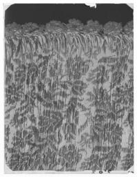| Keywords: Tröja av svart atlas och guldbrokad, 1650-tal - Livrustkammaren - 11054-negative.tif LSH artwork Friderich Feuerbrun pärlstickare David Pärlestickare pärlstickare sv Dräkten införskaffades från Frankrike 1647 säkerligen inför drottning Kristinas kröning Många skarvar visar att dräkten kommit till användning vid senare tillfällen då den måst ändras efter ägarens tilltagande kroppsvolm Detta är en dräkt som man mycket gärna skulle vilja sätta i samband med Karl X Gustavs kröning men det finns ännu inget dokumentariskt bevis för detta dräkten ingår ev i fransyska varorna Det är en synnerligen rikt utstyrd dräkt och den har såväl i sitt broderi som i sin foder brokad en ovanligt hög guldhalt I 1671 års inventarium sägs det att dräkten utgörs av kappa tröja byxor knäband skorosor och handskar Allt av svart atlas med Gull heelöfwer borderat Numera är tyvärr dräkten inte längre så fullständig både 1671 och 1676 års inventarier vittnar visserligen om kappans existens men därefter är den försvunnen man hade redan 1671 tagit bort spetsarna av guld och 20 år senare omtalas kappan ej längre Nuvarande inventarium omtalar blott tröja byxor och 1 handske Under ett annat inventarienummer 3435 har emellertid kunnat identifieras ett dräkttillbehör nämligen ett gehäng med samma broderi Den svarta atlasen har en vådbredd av ca 53 cm utan stad Staden är 1 3 cm bred 10 gröna 10 vita 10 gröna 10 vita 10 gröna samt 5 tjocka svarta trådar - tuskaft Trådarnas antal kan variera Det hela ytan täckande broderiet är utfört i läggsöm och har en mönsterrapport av h 10 cm b 6 8 cm Det är utfört med olika sorters guldkantiljer samt paljettsträngar Längs en del kantsömmar har man sytt på ett smalt guldsnöre bestående av en tvinnad tråd omspunnen med lan Broderiet är nersytt med vitt och gult silke samt tjockare rosa lintråd Analysresultat Tråd och lan av legerat guld huvudbeståndsdelar Silver xxGuld xxxKoppar xxxZink 0Mönstret är ett stiliserat blomstermönster där ett ringformigt omtag snarast utvecklats till en krona som utdragna klockliknande blomkalkar vända sig till eller ifrån I plaggen kan man observera att broderiet uppvisar olika kvaliteter och här kan även spåras skarvar i tyget underlaget De tillskurna bitarna uppvisa en klumpigare torrare karaktär i broderiets utförande samt smärre avvikelser från det gängse utförandet Så t ex har i tröjan den lilla 5-bladiga blomman ovanför kronan sitt översta mellersta blad sytt med horisontella kantiljer istället för vertikala som det borde varit Mönstret är också gyttrigare och oredigare Kronans tinnar är omramade av i öglor lagda konturtrådar och ej som i det ursprungliga broderiet där konturen går upp och ned Mönsterrapport ca h 77 mm b 58 mm Tröjan av innocenttyp är sydd med 2 framstycken som utökats såväl upptill på axelpartiet som utefter ärmringningen och längs sidosömmen med tillsatta bitar I ryggen har skarvstyckena infogats längs en mittsöm ursprungligen kunde ryggstycket ha varit helt Nu ligger emellertid på ömse sidor mittsömmen en smal blott 1 5 cm bred skarv Likaså har man även baktill gjort tröjan något längre genom skarvar utefter axel- och halsringningarna Ärmarna har bara utvidgats obetydligt genom en skarvad remsa utefter underärmstyckets bakre övre del samt på bägge styckena nertill utefter ytterkantens söm ärmsprundets sida ca 27 cm Kragen har klippts upp på samma sätt som ryggstycket så att intill mittsömmen 2 små skarvstycken ligga på ömse sidor synbarligen även placerade upp- och nedvända Tröjan har 10 skört och i midjesömmen sitta på insidan 8 st byxtampar vardera med 2 hål Fodret utgöres av guldbrokad med svart botten Det har en vådbredd av minst 47 cm ev ca52 x 14 á 15 tr/cm2 Det är en ripsvävnad med varp av svart otvinnat silke Inslagen är 14 st med gult silke högertvinnad med guldlan samt 14 st med gult silke högertvinnad med guldlan samt 14 st svarta med guldlan på rätan Stad ca 1 3 cm 8 gröna 9 vita 12 gröna 8 vita 11 gröna 6 svarta trådar - de färgade i atlasbindning de svarta i lärftsbindning Mönsterrapport h 7 7 cm b 5 8 Mönstret består av halvnaturalistiska små blomsterkvistar Analysresultat Metalltråd tvinnad med textiltråd huvudbeståndsdelar Silver xxxGuld xxKoppar xxZink 0Då fodret är mycket trasigt och slitet har man fodrat in kragen och den övre delen av tröjan med svart taft Skörten som ju också är fodrade med brokaden har fått bitar av denna på varierande led Man har givetvis velat utnyttja det dyrbara materialet till fullo I framkanten på vänster sida har tröjan en knapphålsrad med 23 knapphål 2 cm långa På motstående sida finns 22 knappar i behåll de är 1 2 cm i diameter Knapphålsraden är på undersidan fodrad med guldbrokad av samma typ som finns i byxornas fickor Nertill i framstyckena finns planschetter som når t o m det 13 e knapphålet eller är ca 22 cm långa Dessa är klädda med något grövre linnelärft än den oblekta linnelärft som utgör mellanfoder i tröjan 23x18 tr/cm2 Det finns 3 knappar med tränsar i ståndkragen Knapparna är överklädda med olika guldtrådar lan och kantiljer I midjan på tröjan har man mellan fodren lagt en avklippt stadremsa vävd randig i gult och orange med svart som ev är en avklippt stad från någon annan dräkts tyg ev den oskurna svarta sammetsdräkten nr 3421 Detta för att ge mera styrsel åt plagget Att man klippt till plaggets olika delar och beräknat sömmarnas placering innan man broderat dem visar bl a ärmarnas nedre parti som på den broderade sidan ju skulle vikas till uppslag De har alltså ej behövt broderas ända ned utan man har lämnat den svarta atlasen bar på ett knappt 10 cm brett stycke Blott mitt fram på högra sidan under knappraden finns en knypplad ca 1 7 cm bred guldspets med guldlan kvar original caption Kristinas kröning Karl X Gustavs kröning