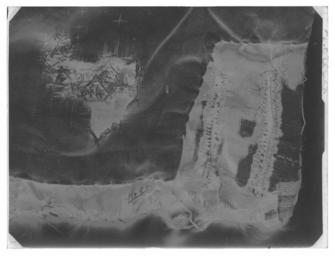| Keywords: Tröja av svart atlas och guldbrokad, 1650-tal - Livrustkammaren - 79626-negative.tif LSH artwork Friderich Feuerbrun pärlstickare David Pärlestickare pärlstickare sv Dräkten införskaffades från Frankrike 1647 säkerligen inför drottning Kristinas kröning Många skarvar visar att dräkten kommit till användning vid senare tillfällen då den måst ändras efter ägarens tilltagande kroppsvolm Detta är en dräkt som man mycket gärna skulle vilja sätta i samband med Karl X Gustavs kröning men det finns ännu inget dokumentariskt bevis för detta dräkten ingår ev i fransyska varorna Det är en synnerligen rikt utstyrd dräkt och den har såväl i sitt broderi som i sin foder brokad en ovanligt hög guldhalt I 1671 års inventarium sägs det att dräkten utgörs av kappa tröja byxor knäband skorosor och handskar Allt av svart atlas med Gull heelöfwer borderat Numera är tyvärr dräkten inte längre så fullständig både 1671 och 1676 års inventarier vittnar visserligen om kappans existens men därefter är den försvunnen man hade redan 1671 tagit bort spetsarna av guld och 20 år senare omtalas kappan ej längre Nuvarande inventarium omtalar blott tröja byxor och 1 handske Under ett annat inventarienummer 3435 har emellertid kunnat identifieras ett dräkttillbehör nämligen ett gehäng med samma broderi Den svarta atlasen har en vådbredd av ca 53 cm utan stad Staden är 1 3 cm bred 10 gröna 10 vita 10 gröna 10 vita 10 gröna samt 5 tjocka svarta trådar - tuskaft Trådarnas antal kan variera Det hela ytan täckande broderiet är utfört i läggsöm och har en mönsterrapport av h 10 cm b 6 8 cm Det är utfört med olika sorters guldkantiljer samt paljettsträngar Längs en del kantsömmar har man sytt på ett smalt guldsnöre bestående av en tvinnad tråd omspunnen med lan Broderiet är nersytt med vitt och gult silke samt tjockare rosa lintråd Analysresultat Tråd och lan av legerat guld huvudbeståndsdelar Silver xxGuld xxxKoppar xxxZink 0Mönstret är ett stiliserat blomstermönster där ett ringformigt omtag snarast utvecklats till en krona som utdragna klockliknande blomkalkar vända sig till eller ifrån I plaggen kan man observera att broderiet uppvisar olika kvaliteter och här kan även spåras skarvar i tyget underlaget De tillskurna bitarna uppvisa en klumpigare torrare karaktär i broderiets utförande samt smärre avvikelser från det gängse utförandet Så t ex har i tröjan den lilla 5-bladiga blomman ovanför kronan sitt översta mellersta blad sytt med horisontella kantiljer istället för vertikala som det borde varit Mönstret är också gyttrigare och oredigare Kronans tinnar är omramade av i öglor lagda konturtrådar och ej som i det ursprungliga broderiet där konturen går upp och ned Mönsterrapport ca h 77 mm b 58 mm Tröjan av innocenttyp är sydd med 2 framstycken som utökats såväl upptill på axelpartiet som utefter ärmringningen och längs sidosömmen med tillsatta bitar I ryggen har skarvstyckena infogats längs en mittsöm ursprungligen kunde ryggstycket ha varit helt Nu ligger emellertid på ömse sidor mittsömmen en smal blott 1 5 cm bred skarv Likaså har man även baktill gjort tröjan något längre genom skarvar utefter axel- och halsringningarna Ärmarna har bara utvidgats obetydligt genom en skarvad remsa utefter underärmstyckets bakre övre del samt på bägge styckena nertill utefter ytterkantens söm ärmsprundets sida ca 27 cm Kragen har klippts upp på samma sätt som ryggstycket så att intill mittsömmen 2 små skarvstycken ligga på ömse sidor synbarligen även placerade upp- och nedvända Tröjan har 10 skört och i midjesömmen sitta på insidan 8 st byxtampar vardera med 2 hål Fodret utgöres av guldbrokad med svart botten Det har en vådbredd av minst 47 cm ev ca52 x 14 á 15 tr/cm2 Det är en ripsvävnad med varp av svart otvinnat silke Inslagen är 14 st med gult silke högertvinnad med guldlan samt 14 st med gult silke högertvinnad med guldlan samt 14 st svarta med guldlan på rätan Stad ca 1 3 cm 8 gröna 9 vita 12 gröna 8 vita 11 gröna 6 svarta trådar - de färgade i atlasbindning de svarta i lärftsbindning Mönsterrapport h 7 7 cm b 5 8 Mönstret består av halvnaturalistiska små blomsterkvistar Analysresultat Metalltråd tvinnad med textiltråd huvudbeståndsdelar Silver xxxGuld xxKoppar xxZink 0Då fodret är mycket trasigt och slitet har man fodrat in kragen och den övre delen av tröjan med svart taft Skörten som ju också är fodrade med brokaden har fått bitar av denna på varierande led Man har givetvis velat utnyttja det dyrbara materialet till fullo I framkanten på vänster sida har tröjan en knapphålsrad med 23 knapphål 2 cm långa På motstående sida finns 22 knappar i behåll de är 1 2 cm i diameter Knapphålsraden är på undersidan fodrad med guldbrokad av samma typ som finns i byxornas fickor Nertill i framstyckena finns planschetter som når t o m det 13 e knapphålet eller är ca 22 cm långa Dessa är klädda med något grövre linnelärft än den oblekta linnelärft som utgör mellanfoder i tröjan 23x18 tr/cm2 Det finns 3 knappar med tränsar i ståndkragen Knapparna är överklädda med olika guldtrådar lan och kantiljer I midjan på tröjan har man mellan fodren lagt en avklippt stadremsa vävd randig i gult och orange med svart som ev är en avklippt stad från någon annan dräkts tyg ev den oskurna svarta sammetsdräkten nr 3421 Detta för att ge mera styrsel åt plagget Att man klippt till plaggets olika delar och beräknat sömmarnas placering innan man broderat dem visar bl a ärmarnas nedre parti som på den broderade sidan ju skulle vikas till uppslag De har alltså ej behövt broderas ända ned utan man har lämnat den svarta atlasen bar på ett knappt 10 cm brett stycke Blott mitt fram på högra sidan under knappraden finns en knypplad ca 1 7 cm bred guldspets med guldlan kvar original caption Kristinas kröning Karl X Gustavs kröning