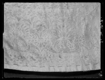 | Keywords: Tröja av vit sidenatlas. Buren av Karl X Gustav (1622-1660) vid kröningen 1654-06-06 - Livrustkammaren - 11107.tif LSH artwork Friderich Feuerbrun pärlstickare sv Anm Först nämnd i Klädkammarens räkenskaper 1654 Buren av Karl X Gustav vid kröningsceremonien i Uppsala domkyrka den 6 juni 1654 troligen tillsammans med vita skor och handskar och en svart hatt med vita plymer Dräktens ytdekor utförd 1654 av pärlstickaren Friderich Feuerbrun Tröjan är av innocenttyp skuren i 2 framstycken utefter vilkas framkanter staden ligger 1 bakstycke 10 små skört 2 svängda ärmstycken till varje ärm samt ståndkrage skuren i ett enda svängt stycke Längs vänster framkant går en knapphålsrad med 21 knapphål 2 cm långa sydda med vitt högertvinnat silke c a 9 stygn/cm över 1 tråd Endast 19 av knapparna är kvar på motsatta sidan De är klädda med silvertråd d 1 2 cm Ståndkragens samtliga 3 knappar är i behåll Kragen som framtill är 5 cm hög och 3 5 cm hög baktill har för knäppningen på vänster sida 3 st i flätteknik utförda silversnören Kragen är fastkastad vid halsurringningen med vitt högertvinnat silke Den är styv med mellanfoder av grovlinnelärft 16x14 tr/cm2 med insydda fiskben Dess foder utgörs på insidan av vit taft 54x52 tr/cm2 På de båda framstyckena har ytterligare ett stycke atlas med samma mönstring av 10-14 cm bredd fästs ovanpå det ordinarie tyget liksom små flikar extratyg sytts på de 2 främsta skörten Tröjan är f ö hopsydd av tygstycken som inte alltid passats ihop med samma precision som den rundskurna kappan Ärmarna är som vanligt öppna utefter den svängda inre sömmen sånär som på de 14 nedersta cm som bildar uppslaget Nedtill i ärmarna finns också ett mellanfoder av grov oblekt linnelärft 17x15 tr/cm2 det gällde att få styrsel i uppslagen Tröjan är fodrad med silverbrokad dess vådbredd är minst 51 cm 66x17 á 18tr/cm2 Botteninslaget har på rätan silverlan Mot detta avtecknar sig blommönstret i flotterande trådar utan metalltrådstillsats Silket är vitt och otvinnat Staden är 0 9 cmbred 13 gröna 4 orange 11 gröna 1 vit och orange tjockare tråd Tuskaft Mönsterrapport h 7 3 cm b 6 8 cm Mönstret är detsamma som fodret i tröjan nr 3386 Tröjan är helt mellanfodrad med grov linnelärft 16x13 tr/cm2 Mitt fram i de till en spets utdragna framstyckena är planschetter inlagda som når till en höjd av 21 cm Av den ursprungliga dekoren av silverspetsar återstår nu blott ett fragment på den översta knappen Antagligen har spetsen löpt som en 4 cm bred garnering runt plaggets sömmar och kanter De har rönt samma öde som kappans spetsar I midjan sitter på insidan i tröjan 8 st byxtampar av foderbrokaden vardera med 2 hål original caption Karl X Gustavs kröning 1654 silk Färg vit d1 - dräkt - yttermaterial material siden - silver d2 - dräkt - foder material silver LRK Karl X Gustav av Sverige Tre Karlar 1984-1985 Modelejon 2002 Fest och fritid vid hovet 2003 place of origin original filename LN_E04237 62161 inventory number LRK 25597 11107 CC0 Tröja av vit sidenatlas Buren av Karl X Gustav 1622-1660 vid kröningen 1654-06-06 - Livrustkammaren - 11107-negative tif <gallery caption Different images of same object > File Tröja av vit sidenatlas Buren av Karl X Gustav 1622-1660 vid kröningen 1654-06-06 - Livrustkammaren - 69846 tif File Tröja av vit sidenatlas Buren av Karl X Gustav 1622-1660 vid kröningen 1654-06-06 - Livrustkammaren - 78405 tif File Tröja av vit sidenatlas Buren av Karl X Gustav 1622-1660 vid kröningen 1654-06-06 - Livrustkammaren - 69645 tif File Tröja av vit sidenatlas Buren av Karl X Gustav 1622-1660 vid kröningen 1654-06-06 - Livrustkammaren - 52558 tif File Tröja av vit sidenatlas Buren av Karl X Gustav 1622-1660 vid kröningen 1654-06-06 - Livrustkammaren - 43998 tif File Tröja av vit sidenatlas Buren av Karl X Gustav 1622-1660 vid kröningen 1654-06-06 - Livrustkammaren - 236 tif File Tröja av vit sidenatlas buren av Karl X Gustav vid kröningen 1654 - Livrustkammaren - 48045 tif File Tröja av vit sidenatlas Buren av Karl X Gustav 1622-1660 vid kröningen 1654-06-06 - Livrustkammaren - 11108 tif File Karl X Gustavs kröningsdräkt från 1654 - Livrustkammaren - 21688 tif File Tröja av vit sidenatlas Buren av Karl X Gustav 1622-1660 vid kröningen 1654-06-06 - Livrustkammaren - 69681 tif File Tröja av vit sidenatlas Buren av Karl X Gustav 1622-1660 vid kröningen 1654-06-06 - Livrustkammaren - 18316 tif File Tröja av vit sidenatlas Buren av Karl X Gustav 1622-1660 vid kröningen 1654-06-06 - Livrustkammaren - 78204 tif File Tröja av vit sidenatlas Buren av Karl X Gustav 1622-1660 vid kröningen 1654-06-06 - Livrustkammaren - 1081 tif File Tröja av vit sidenatlas Buren av Karl X Gustav 1622-1660 vid kröningen 1654-06-06 - Livrustkammaren - 1160 tif File Tröja av vit sidenatlas Buren av Karl X Gustav 1622-1660 vid kröningen 1654-06-06 - Livrustkammaren - 26878 tif File Tröja av vit sidenatlas Buren av Karl X Gustav 1622-1660 vid kröningen 1654-06-06 - Livrustkammaren - 2548 tif File Tröja av vit sidenatlas Buren av Karl X Gustav 1622-1660 vid kröningen 1654-06-06 - Livrustkammaren - 2547 tif File Tröja av vit sidenatlas Buren av Karl X Gustav 1622-1660 vid kröningen 1654-06-06 - Livrustkammaren - 61119 tif File Mönstrat tyg av sidenatlas och silverbrokad från 1654 - Livrustkammaren - 30927 tif </gallery> <gallery caption Related objects > File Byxor av vit sidenatlas Buren av Karl X Gustav 1622-1660 vid kröningen 1654-06-06 - Livrustkammaren - 52723 tif LRK 25598 File Karl X Gustavs kappa från 1654 - Livrustkammaren - 13126 tif LRK 25599 File Byxor av vit sidenatlas Buren av Karl X Gustav 1622-1660 vid kröningen 1654-06-06 - Livrustkammaren - 71034 tif LRK 25598 File Kappa av vit sidenatlas Buren av Karl X Gustav 1622-1660 vid kröningen 1654-06-06 - Livrustkammaren - 28231 tif LRK 25599 File Kappa av vit sidenatlas Buren av Karl X Gusta