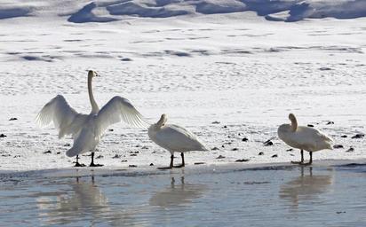 Keywords: trumpeter swans winter park water lake snow birds wildlife nature outdoors cold wings standing