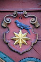 Keywords: truss fachwerkhaus red facade figurine animal bird star gold coat of arms home building