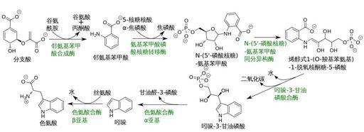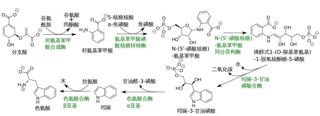 Keywords: Tryptophan biosynthesis (zh-cn).svg Created myself using ChemDraw based on Yikrazuul's Image Tryptophanesynthesis png 色氨酸合成 Tryptophan_biosynthesis png 2011-02-14 13 34 UTC Tryptophan_biosynthesis png Original uploader was Boghog2 at http //en wikipedia org en wikipedia derivative work Shakiestone <span class signature-talk >talk</span> file Tryptophan biosynthesis en svg translation Tryptophan_biosynthesis png PD-user-w Original upload log This image is a derivative work of the following images File Tryptophan_biosynthesis png licensed with PD-user-w 2009-06-07T07 20 45Z File Upload Bot Magnus Manske 3599x1214 218229 Bytes <nowiki> en wikipedia subst CURRENTYEAR subst CURRENTMONTHNAME subst CURRENTDAY Created myself using ChemDraw based on Yikrazuul's Image Tryptophanesynth</nowiki> Uploaded with derivativeFX Tryptophan |