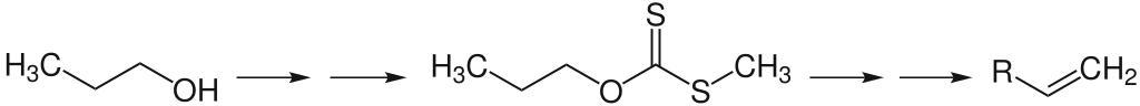 Keywords: Tschugajew-Bruttoreaktion-V1.svg de Als Tschugajew-Reaktion oder -Eliminierung bezeichnet man die Dehydratisierung von primären Alkoholen zu terminalen Alkenen own Faynara 2010-06-17 Chugaev elimination