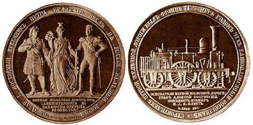 | Keywords: TSRailwaysCoin.jpg en Russian medal minted on the occasion of the opening of the Tsarskoye Selo Railways http //family-history ru/material/history/spb/spb_33 html Author century 19 PD-old По пе имет у лицевой части медали надпись « иколай I достойный п еемник Пет а Великого ввел в России железные до оги» Под г уппой изоб ажавшей иколая I ине ву и Пет а I надпись «Пе вая железная до ога от Санкт-Пете бу га до Павловска отк ыта 30 октяб я 1837 года» а об атной сто оне медали в цент е изоб ажен па овоз под ним слова «Основатели пе вой железной до оги г аф Алексей Боб инский Бенедикт К аме и И К Плитт» а по пе имет у «Ст оителем пе вой железной до оги был Ф анц Ге стне одом чех единоплеменный оссиянам» Из-за того что 30 октяб я была отк ыта до ога только из Санкт-Пете бу га до Ца ского Села медаль никому не в учалась видимо по аспо яжению иколая I http //clubs ya ru/4611686018427418668/posts xml tag 9714365 Railway lines in Russia |