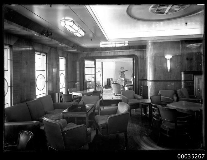 | Keywords: hood collection hoodcollection 35267 samuel j hood collection samueljhoodcollection hood tss awatea tssawatea awatea union steam ship company unionsteamshipcompany union steamship company of new zealand unionsteamshipcompanyofnewzealand new zealand newzealand passenger seating area passengerseatingarea ship's interior shipsinterior 1930s furniture 1930sfurniture 1930s cruise liner cruiseliner passenger liner passengerliner passenger ships passengerships sydney circular quay circularquay maiden voyage maidenvoyage blackandwhite monochrome indoor coffee beverage food black and white This photograph depicts the passenger seating area on board TSS AWATEA. AWATEA, built in 1936, was owned by Union Steamship Company and was known as the 'Queen of the Tasman Sea'. It was a luxury liner that serviced the trans-Tasman route. AWATEA was requisitioned by the British Government during World War II and was sunk in 1942. This photo is part of the Australian National Maritime Museum’s Samuel J. Hood Studio collection. Sam Hood (1872-1953) was a Sydney photographer with a passion for ships. His 60-year career spanned the romantic age of sail and two world wars. The photos in the collection were taken mainly in Sydney and Newcastle during the first half of the 20th century. The ANMM undertakes research and accepts public comments that enhance the information we hold about images in our collection. This record has been updated accordingly. Photographer: Samuel J. Hood Studio Collection Object no. 00035267 This photograph depicts the passenger seating area on board TSS AWATEA. AWATEA, built in 1936, was owned by Union Steamship Company and was known as the 'Queen of the Tasman Sea'. It was a luxury liner that serviced the trans-Tasman route. AWATEA was requisitioned by the British Government during World War II and was sunk in 1942. This photo is part of the Australian National Maritime Museum’s Samuel J. Hood Studio collection. Sam Hood (1872-1953) was a Sydney photographer with a passion for ships. His 60-year career spanned the romantic age of sail and two world wars. The photos in the collection were taken mainly in Sydney and Newcastle during the first half of the 20th century. The ANMM undertakes research and accepts public comments that enhance the information we hold about images in our collection. This record has been updated accordingly. Photographer: Samuel J. Hood Studio Collection Object no. 00035267 |
