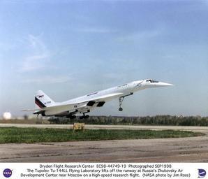 | Keywords: Tu-144LL SST Flying Laboratory Lifts off Runway on a High-Speed Research Flight DVIDS692512.jpg en The Tupolev Tu-144LL lifts off from the Zhukovsky Air Development Center near Moscow Russia on a 1998 test flight NASA teamed with American and Russian aerospace industries for an extended period in a joint international research program featuring the Russian-built Tu-144LL supersonic aircraft The object of the program was to develop technologies for a proposed future second-generation supersonic airliner to be developed in the 21st Century The aircraft's initial flight phase began in June 1996 and concluded in February 1998 after 19 research flights A shorter follow-on program involving seven flights began in September 1998 and concluded in April 1999 All flights were conducted in Russia from Tupolev's facility at the Zhukovsky Air Development Center near Moscow The centerpiece of the research program was the Tu 144LL a first-generation Russian supersonic jetliner that was modified by its developer/builder Tupolev ANTK aviatsionnyy nauchno-tekhnicheskiy kompleks-roughly aviation technical complex into a flying laboratory for supersonic research Using the Tu-144LL to conduct flight research experiments researchers compared full-scale supersonic aircraft flight data with results from models in wind tunnels computer-aided techniques and other flight tests The experiments provided unique aerodynamic structures acoustics and operating environment data on supersonic passenger aircraft Data collected from the research program was being used to develop the technology base for a proposed future American-built supersonic jetliner Although actual development of such an advanced supersonic transport SST is currently on hold commercial aviation experts estimate that a market for up to 500 such aircraft could develop by the third decade of the 21st Century The Tu-144LL used in the NASA-sponsored research program was a D model with different engines than were used in production-model aircraft Fifty experiments were proposed for the program and eight were selected including six flight and two ground engine tests The flight experiments included studies of the aircraft's exterior surface internal structure engine temperatures boundary-layer airflow the wing's ground-effect characteristics interior and exterior noise handling qualities in various flight profiles and in-flight structural flexibility The ground tests studied the effect of air inlet structures on airflow entering the engine and the effect on engine performance when supersonic shock waves rapidly change position in the engine air inlet A second phase of testing further studied the original six in-flight experiments with additional instrumentation installed to assist in data acquisition and analysis A new experiment aimed at measuring the in-flight deflections of the wing and fuselage was also conducted American-supplied transducers and sensors were installed to measure nose boom pressures angle of attack and sideslip angles with increased accuracy Two NASA pilots Robert Rivers of Langley Research Center Hampton Virginia and Gordon Fullerton from Dryden Flight Research Center Edwards California assessed the aircraft's handling at subsonic and supersonic speeds during three flight tests in September 1998 The program concluded after four more data-collection flights in the spring of 1999 The Tu-144LL model had new Kuznetsov NK-321 turbofan engines rated at more than 55 000 pounds of thrust in full afterburner The aircraft is 215 feet 6 inches long and 42 feet 2 inches high with a wingspan of 94 feet 6 inches The aircraft is constructed mostly of light aluminum alloy with titanium and stainless steel on the leading edges elevons rudder and the under-surface of the rear fuselage NASA Identifier NIX-EC98-44749-19 2009-09-23 Glenn Research Center https //www dvidshub net/image/692512 692512 2012-10-10 12 51 WASHINGTON DC US PD-USGov Langley Research Center Images from DoD uploaded by Fæ |