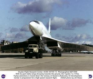 | Keywords: Tu-144LL SST Flying Laboratory Being Towed Down Taxiway DVIDS694138.jpg en With its giant delta wings drooping toward the ground the Tupolev Tu-144LL is towed down a taxiway at the Zhukovsky Air Development Center near Moscow Russia in preparation for a high-speed research flight in 1998 NASA teamed with American and Russian aerospace industries for an extended period in a joint international research program featuring the Russian-built Tu-144LL supersonic aircraft The object of the program was to develop technologies for a proposed future second-generation supersonic airliner to be developed in the 21st Century The aircraft's initial flight phase began in June 1996 and concluded in February 1998 after 19 research flights A shorter follow-on program involving seven flights began in September 1998 and concluded in April 1999 All flights were conducted in Russia from Tupolev's facility at the Zhukovsky Air Development Center near Moscow The centerpiece of the research program was the Tu 144LL a first-generation Russian supersonic jetliner that was modified by its developer/builder Tupolev ANTK aviatsionnyy nauchno-tekhnicheskiy kompleks-roughly aviation technical complex into a flying laboratory for supersonic research Using the Tu-144LL to conduct flight research experiments researchers compared full-scale supersonic aircraft flight data with results from models in wind tunnels computer-aided techniques and other flight tests The experiments provided unique aerodynamic structures acoustics and operating environment data on supersonic passenger aircraft Data collected from the research program was being used to develop the technology base for a proposed future American-built supersonic jetliner Although actual development of such an advanced supersonic transport SST is currently on hold commercial aviation experts estimate that a market for up to 500 such aircraft could develop by the third decade of the 21st Century The Tu-144LL used in the NASA-sponsored research program was a D model with different engines than were used in production-model aircraft Fifty experiments were proposed for the program and eight were selected including six flight and two ground engine tests The flight experiments included studies of the aircraft's exterior surface internal structure engine temperatures boundary-layer airflow the wing's ground-effect characteristics interior and exterior noise handling qualities in various flight profiles and in-flight structural flexibility The ground tests studied the effect of air inlet structures on airflow entering the engine and the effect on engine performance when supersonic shock waves rapidly change position in the engine air inlet A second phase of testing further studied the original six in-flight experiments with additional instrumentation installed to assist in data acquisition and analysis A new experiment aimed at measuring the in-flight deflections of the wing and fuselage was also conducted American-supplied transducers and sensors were installed to measure nose boom pressures angle of attack and sideslip angles with increased accuracy Two NASA pilots Robert Rivers of Langley Research Center Hampton Virginia and Gordon Fullerton from Dryden Flight Research Center Edwards California assessed the aircraft's handling at subsonic and supersonic speeds during three flight tests in September 1998 The program concluded after four more data-collection flights in the spring of 1999 The Tu-144LL model had new Kuznetsov NK-321 turbofan engines rated at more than 55 000 pounds of thrust in full afterburner The aircraft is 215 feet 6 inches long and 42 feet 2 inches high with a wingspan of 94 feet 6 inches The aircraft is constructed mostly of light aluminum alloy with titanium and stainless steel on the leading edges elevons rudder and the under-surface of the rear fuselage NASA Identifier NIX-EC98-44749-15 2009-09-23 Glenn Research Center https //www dvidshub net/image/694138 694138 2012-10-10 13 13 WASHINGTON DC US PD-USGov Langley Research Center Images from DoD uploaded by Fæ |