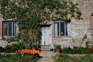 Keywords: tudor cottage old brickwork leaded-light windows oak door and lintel seat terracotta pots daffodils orange tulips