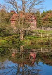 Keywords: tudor style house museum pond reflection autumn fall farm