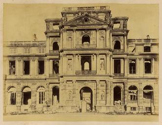 | Keywords: Tuileries Palace; Clock Pavilion WDL1254.png Artwork ru Б аквейе Б уно 1823 1875 гг fr Braquehais Bruno 1823-1875 en Braquehais Bruno 1823-1875 zh 布鲁诺·布拉奇海 ,1823-1875 年 pt Braquehais Bruno 1823-1875 ar براكهيه برونو، 1823-1875 es Braquehais Bruno 1823-1875 ru Дво ец Тюиль и Павильон часов fr Palais des Tuileries pavillon de l Horloge en Tuileries Palace; Clock Pavilion zh 伊勒里宫;钟阁 pt Palácio das Tulherias; Pavilhão do Relógio ar قصر التيليري؛ مبنى الساعة ru П ичиной ф анко-п усской войны стал ост нап яженности в отношениях между Ф анцией и П уссией в 1860-х гг Ф анция п и импе ато е аполеоне III была полна ешимости п ове ить астущую силу П уссии и отомстить за то что она ассмат ивала как яд дипломатических унижений П уссия п и канцле е Отто фон Бисма ке считала что война ге манских госуда ств п отив Ф анции под уководством П уссии станет ешающим шагом к созданию единой Ге манской импе ии Конфликт начался 19 июля 1870 г когда Ф анция объявила войну Ф анцузская а мия оказалась ужасно неподготовленной и поте пела сок ушительное по ажение в битве п и Седане отк ыв до огу на Па иж К 19 сентяб я немцкие войска полностью ок ужили го од и начали осаду кото ая п одлилась более четы ех месяцев От езанные от поставок п одовольствия из сельской местности па ижане пытались выжить питаясь собаками кошками и даже животными из па ижского зоопа ка Де евья на Елисейских полях и в па ках были вы ублены и использованы в качестве топлива 5 янва я немецкие войска начали бомба ди овку го ода кото ая п одолжалась по несколько часов каждую ночь в течение 23 суток а ок естности Па ижа было сб ошено около 12 000 сна ядов кото ые убили около 400 человек Па иж сдался 28 янва я в сущности положив конец войне За по ажением ф анцузов последовало на одное восстание и установление в а те 1871г Па ижской коммуны еволюционного п авительства сфо ми ованного в соответствии с ана хистскими и социалистическими п инципами Коммуна была жестоко подавлена в мае 1871 г ф анцузскими войсками п авительства Адольфа Тье а Во в емя неп одолжительного конт оля над Па ижем коммуна ы аз ушали импе ато скую колонну на Вандомской площади Подавление коммуны п ивело к дальнейшим значительным аз ушениям в го оде когда коммуна ы подожгли дво ец Тюиль и Лув и д угие здания К оме того многие здания пост адали или были аз ушены во в емя отчаянной пе ест елки между коммуна ами и конт еволюционными силами Siege de Paris 1870 1871 Осада Па ижа 1870 1871 гг п едставляет собой альбом из 110 фотог афий сделанных Огюстом Б уно Б аквейе 1823 1875 гг ф анцузским фотог афом и п ог ессивным фотожу налистом документи овавшим осаду и последствия бомба ди овок а также аз ушения п оизошедшие во в емя Па ижской коммуны <br>Замки и дво цы; Ф анко-п усская война 1870 1871 гг ; Память ми а; Дво ец Тюиль и Па иж Ф анция ; Уще б нанесенный войной fr La guerre franco-allemande fut provoquée par l escalade des tensions entre la France et la Prusse dans les années 1860 La France sous l empereur Napoléon III était déterminée à contenir la croissance de la puissance prussienne et à venger ce qui était considéré comme une série d humiliations diplomatiques La Prusse sous le chancelier Otto von Bismarck considérait qu une guerre dirigée par la Prusse et menée par les États allemands contre la France serait un acte décisif menant à la création d un empire allemand unifié Le conflit débuta le 19 juillet 1870 jour où la France déclara la guerre L armée française s avéra terriblement mal préparée et subit une défaite désastreuse lors de la bataille de Sedan laissant la voie libre vers Paris Le 19 septembre les Allemands encerclèrent complètement la ville et commencèrent un siège qui allait durer plus de quatre mois Coupés du ravitaillement provenant de la campagne les Parisiens survécurent en mangeant les chiens les chats et même la plupart des animaux du zoo de Paris Les arbres des Champs-Élysées et des parcs furent coupés et brûlés pour servir de combustible Le 5 janvier les armées allemandes entreprirent le bombardement de la ville qui dura plu