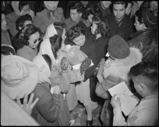 | Keywords: Tule Lake Relocation Center, Newell, California. Mixed emotions are displayed by this group of frie . . . - NARA - 536957.jpg Scope and content The full caption for this photograph reads Tule Lake Relocation Center Newell California Mixed emotions are displayed by this group of friends and well wishers who gathered to wish Godspeed to a group of eleven evcauees who are leaving the center Of this group four were transfers to the Central Utah Project and the other seven were students and workers going out on indefinite leave This photo shows that not all people of Japanese ancestry are stoical Note the girl on the left crying General notes 536957 Local identifier 210-G-B249 Department of the Interior War Relocation Authority 02/16/1944 - 06/30/1946 NARA-Author Stewart Francis War Relocation Authority photographer Photographer 8464475 <br /> Still Picture Records Section Special Media Archives Services Division NWCS-S National Archives at College Park 8601 Adelphi Road College Park MD 20740-6001 1943-01-28 Record group Record Group 210 Records of the War Relocation Authority 1941 - 1989 Record group ARC 537 Central Photographic File of the War Relocation Authority compiled 1942 - 1945 Series ARC 536000 File unit File unit ARC Variant control numbers NAIL Control Number NWDNS-210-G-B249 Other versions <gallery> File Tule_Lake_Relocation_Center _Newell _California _Mixed_emotions_are_displayed_by_this_group_of_frie_ _ _ _-_NARA_-_536957 tif tif File Tule_Lake_Relocation_Center _Newell _California _Mixed_emotions_are_displayed_by_this_group_of_frie_ _ _ _-_NARA_-_536957 jpg jpg </gallery> NARA-cooperation PD-USGov Tule Lake War Relocation Center |