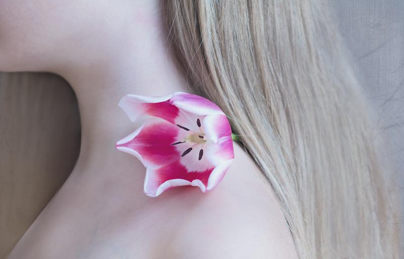 Keywords: tulip flower pink white blossom bloom human female shoulder hair close