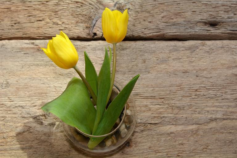 Keywords: tulips vase wood spring flowers cut flowers yellow yellow flowers
