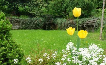 Keywords: tulips yellow flowers garden fountain water feature flow summer flower plant bloom nature blossom bloom
