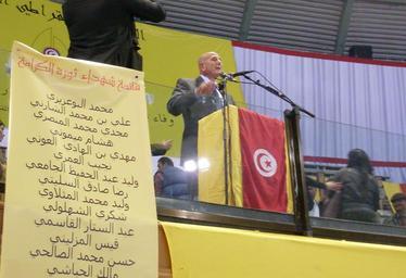 | Keywords: Tunisie PDP 03.jpg fr Ahmed Najib Chebbi dans un meeting du Parti démocrate progressiste à Tunis own M Rais 2011-01-29 Cc-zero Ahmed Nejib Chebbi People with flags of Tunisia Banners in Tunisia Arabic inscriptions in Tunisia Sports Palace of El Menzah |