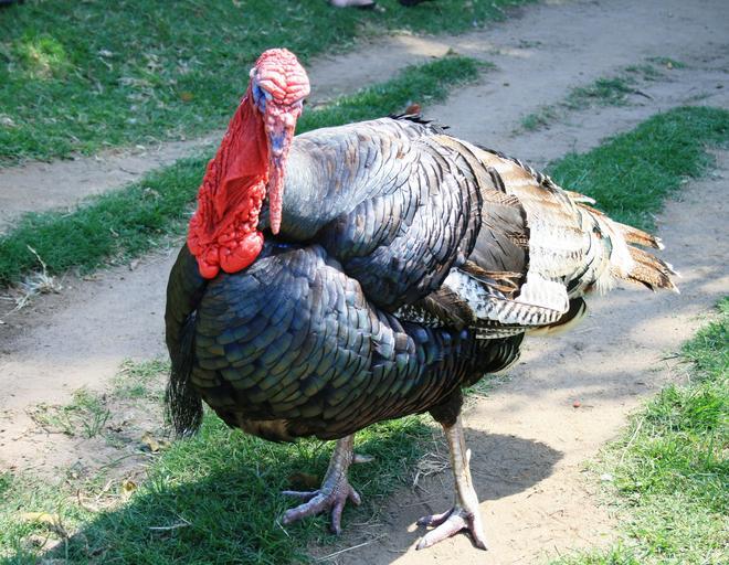 Keywords: turkey fowl poultry farm grey feathers shiny bird heavy gobbler red caruncles snood