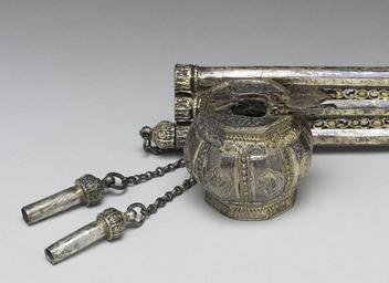 | Keywords: Turkish - Penbox and Inkwell - Walters 57627 - Detail B.jpg The central role of writing in Islamic societies led to calligraphy becoming the most important visual art form Portable pen cases Turkish divit were made with great care and became objects of art themselves Examples from the Ottoman lands are characterized by pronounced end pieces with an inkwell and a tubular arm that held the pens Such pieces were often hinged and had a metal loop for attachment to a belt This parallels the belt-attachable design of the Japanese yatate found elsewhere in this room The yatate and divit elevated pen cases to the status of wearable works of art century 18 Early Modern silver with gilt and niello cm 4 45 5 72 23 18 accession number 57 627 39988 Henry Walters Baltimore date of acquisition unknown by purchase Walters Art Museum Henry Walters Acquired by Henry Walters The World of Islam Saint Mary's College St Mary's City 1981 Illuminated Manuscripts Masterpieces in Miniature The Walters Art Gallery Baltimore 1984-1985 Islamic Culture and the Medical Arts National Library of Medicine Bethesda 1994 Poetry and Prayer Islamic Manuscripts from the Walters Art Museum The Walters Art Museum Baltimore 2010 place of origin Istanbul Turkey Walters Art Museum license Islamic metalwork in the Walters Art Museum Art from Turkey Media contributed by the Walters Art Museum needs category review |