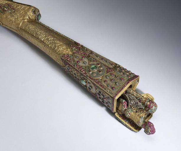 | Keywords: Turkish - Rifle - Walters 5184 - Detail B.jpg Referencing the elite pastimes of hunting and writing this ceremonial jeweled rifle set includes a dagger pen case penholder with pen penknife cleaner and a spoon-all conveniently housed within the rifle butt Penknives were important elements in the calligrapher's toolset and their handles were often elaborately decorated The hardness of the reed used for pens throughout Islamic lands required a good blade to make a clean cut The small spoon was used to put black powder into the flash pan in preparation for firing the rifle The imperial monogram tughra of the Ottoman ruler Sultan Mahmud I r 1730-54 is inscribed in diamonds inside the hinged panel of the rifle butt The artist Muhammad and the rifle's owner Ahmad Khan who had possession of the rifle at some point are also named 1732-33 Early Modern rifle steel wood gold gilded silver gilded brass silver nephrite diamonds emeralds rubies or spinels ; dagger steel inlaid with gold rubies and beryls cm 24 8 139 7 7 accession number 51 84 22655 R S Pardo Constantinople date and mode of acquisition unknown Henry Walters Baltimore 1903 mode of acquisition unknown Walters Art Museum Henry Walters Acquired by Henry Walters 1903 Translation on barrel What God wills on flintlock Work of Muhammad; its owner is Ahmad Khan tughra hidden under panel in stock is that of Sultan Mahmud I r 1730-1754 place of origin Turkey Walters Art Museum license Islamic metalwork in the Walters Art Museum Weapons in the Walters Art Museum Firearms of the Ottoman Empire Art from Turkey Media contributed by the Walters Art Museum needs category review |