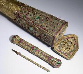 | Keywords: Turkish - Rifle - Walters 5184 - Detail C (2).jpg Referencing the elite pastimes of hunting and writing this ceremonial jeweled rifle set includes a dagger pen case penholder with pen penknife cleaner and a spoon-all conveniently housed within the rifle butt Penknives were important elements in the calligrapher's toolset and their handles were often elaborately decorated The hardness of the reed used for pens throughout Islamic lands required a good blade to make a clean cut The small spoon was used to put black powder into the flash pan in preparation for firing the rifle The imperial monogram tughra of the Ottoman ruler Sultan Mahmud I r 1730-54 is inscribed in diamonds inside the hinged panel of the rifle butt The artist Muhammad and the rifle's owner Ahmad Khan who had possession of the rifle at some point are also named 1732-33 Early Modern rifle steel wood gold gilded silver gilded brass silver nephrite diamonds emeralds rubies or spinels ; dagger steel inlaid with gold rubies and beryls cm 24 8 139 7 7 accession number 51 84 22655 R S Pardo Constantinople date and mode of acquisition unknown Henry Walters Baltimore 1903 mode of acquisition unknown Walters Art Museum Henry Walters Acquired by Henry Walters 1903 Translation on barrel What God wills on flintlock Work of Muhammad; its owner is Ahmad Khan tughra hidden under panel in stock is that of Sultan Mahmud I r 1730-1754 place of origin Turkey <gallery> File Turkish - Rifle - Walters 5184 - Detail C jpg </gallery> Walters Art Museum license Islamic metalwork in the Walters Art Museum Weapons in the Walters Art Museum Firearms of the Ottoman Empire Art from Turkey Media contributed by the Walters Art Museum needs category review |
