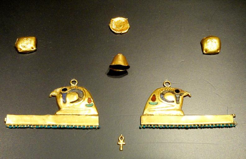 Keywords: Tut-ankh-Amun funerary jewelry, gold with lapis lazuli, Thebes, New Kingdom, 18th Dynasty, 1336-1327 BCE - Nelson-Atkins Museum of Art - DSC08153.JPG Exhibit in the Nelson-Atkins Museum of Art Kansas City Missouri USA Photography was permitted in the museum without restriction; I took this photograph and release it into the public domain Daderot 2011-11-04 17 31 34 Daderot PD-old PD-old Egyptian art in the Nelson-Atkins Museum of Art Treasure of Tutankhamun Jewellery of the 18th dynasty of Egypt |