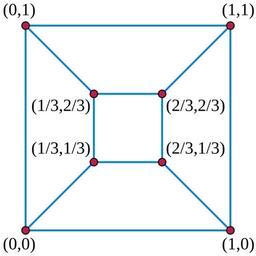 | Keywords: Tutte cube.svg Tutte embedding of the graph of a cube The outer four vertices are fixed at the corners of a unit square and each remaining vertex is at the average of its neighbors' positions 2013-05-28 17 47 33 own David Eppstein cc-zero Uploaded with UploadWizard Undirected planar graphs |