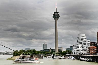Keywords: tv tower düsseldorf media harbour city cities gehrybauten architecture radio tower clouds skyline water river landmark rhine transmission tower