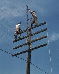 | Keywords: TVA Linemen.jpg TITLE Men working on telephone lines probably near a TVA dam hydroelectric plant CALL NUMBER LC-USW36-339 <P P>P P REPRODUCTION NUMBER LC-DIG-fsac-1a35245 digital file from original transparency LC-USW361-339 color film copy slide MEDIUM 1 transparency color CREATED/PUBLISHED 1942 June CREATOR Palmer Alfred T photographer SUBJECTS Linemen Telephone lines Tennessee Valley Authority Dams Hydroelectric power United States--Tennessee FORMAT Transparencies Color PART OF Farm Security Administration - Office of War Information Collection REPOSITORY Library of Congress Prints and Photographs Division Washington D C 20540 USA DIGITAL ID digital file from original transparency fsac 1a35245 http //hdl loc gov/loc pnp/fsac 1a35245 CARD fsa1992001113/PP NOTES The workers pictured are linemen not electricians Possibly Chickamauga Dam or Douglas Dam Tennessee USA Previous title Adam and Eyon in action - apparently unsourced B w photograph in Lot 12002-36 Transfer; FSA-OWI; 1944 PD-USGov Photographs by Alfred T Palmer Blue sky Linemen Men at work in Tennessee 1942 in Tennessee 1942 photographs People of the United States in 1942 Telephone poles in the United States Tennessee Valley Authority 20th-century men of the United States |