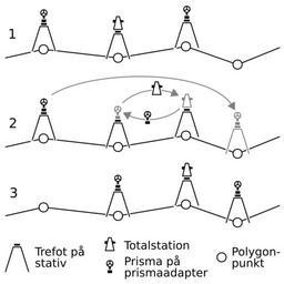 Keywords: Tvångscentrering.svg Tvångscentrering är ett sätt att mäta polygontåg Genom att bara byta plats på totalstationen och prismorna och genom att ha trefoten fastskruvad på stativet så kan man veta att alla mätnigar är gjorda till och från samma punkter Det ger ett bättre resultat vid de efterföljande beräkningarna och om det finns några felaktiga mätningar blir de lättare att upptäcka traverses By only swapping the total station and the prisms and by having the tribrachs fixed to the tripods you will know that you have taken all the readings to and from the same points This will give a better result in the following calulations and if there is some flaved readings they will more easely be found Own Johan Gustafsson 2009-09-11 KJG2007 <gallery> File Leapfrogging svg en Leapfrogging svg </gallery> Survey method diagrams