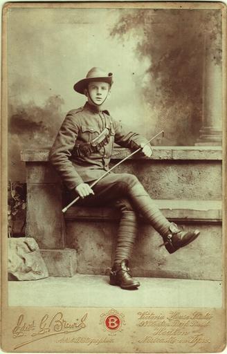 | Keywords: first world war firstworldwar ww1 wor life worlife people Photograph, black and white, showing a soldier in WW1 uniform, taken in studio, sitting on a bench. Bandolier across chest, whip in hand. Hat with side brim upturned. Spurs on his boots indicating cavalry regiment Regional Faces of the First World War. The photograph is from an album relating to the men, women and children from Tyne and Wear who lived, worked or fought during the First World War. Accompanying this photo is the biographical and supporting information that we have about them, but the full story is not always known. Our collections records are not very detailed in some cases. We need your help to fill in the blanks. Do you have any information to add to what is already here? A name? A location? What more can you find out and tell us about their life? If you have some extra information about this photograph, please add your comments, information and any links, images or text. Part of the ‘Wor Life’ project. To find out more please visit www.worlife.org.uk Photograph, black and white, showing a soldier in WW1 uniform, taken in studio, sitting on a bench. Bandolier across chest, whip in hand. Hat with side brim upturned. Spurs on his boots indicating cavalry regiment Regional Faces of the First World War. The photograph is from an album relating to the men, women and children from Tyne and Wear who lived, worked or fought during the First World War. Accompanying this photo is the biographical and supporting information that we have about them, but the full story is not always known. Our collections records are not very detailed in some cases. We need your help to fill in the blanks. Do you have any information to add to what is already here? A name? A location? What more can you find out and tell us about their life? If you have some extra information about this photograph, please add your comments, information and any links, images or text. Part of the ‘Wor Life’ project. To find out more please visit www.worlife.org.uk |