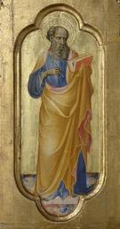 | Keywords: Twee evangelisten Rijksmuseum SK-A-3979.jpeg nl Staande evangelist ten voeten uit een pen in de rechterhand in de linkerhand een boek Waarschijnlijk oorspronkelijk onderdeel van een altaarstuk of een dergelijk ensemble Met geïntegreerde lijst Pendant van SK-A-3980 ; Gherardo Starnina ca 1364 “1413 Florence ca 1407 tempera op paneel Height cm 35 Width cm 14 exhibition history 1934-1934 Italiaansche Kunst in Nederlandsch Bezit Amsterdam Institution Rijksmuseum object history Acquisition 1960 object type PD-US PD-old-100 Data and photography rights All data and all images made available through the API are either in the public domain or are subject to a CC0 license https //www rijksmuseum nl/en/api/terms-and-conditions-of-use cc-zero place of creation Florence http //www rijksmuseum nl/collectie/SK-A-3979 Twee evangelisten Q17335730 Uploaded with GWToolset Twee evangelisten Rijksmuseum SK-A-3979 http //www rijksmuseum nl/media/assets/SK-A-3979 Images uploaded by Fæ Images from the Rijksmuseum Italian Gothic paintings in the Rijksmuseum Amsterdam Gherardo Starnina |