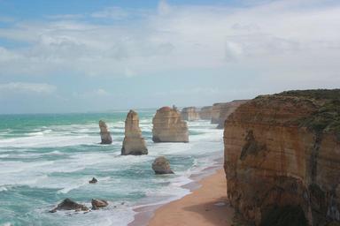 Keywords: twelve apostles australia shore cliffs ocean sea beach seascape sky water sand wave coast coastal marine coastline scenic outdoor nature environment seaside