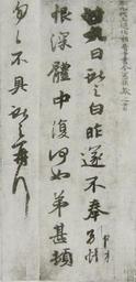 | Keywords: TwentyNinth Wang Xianzhi.JPG en Twenty Ninth day letter Replica of Calligraphy by Wang Xianzhi ACE 344-386 ink on paper 25cm height One part of the collected works handscroll of Wansui Tongtien Tie in Liaoning Province Museum China 廿 日帖 王献之の書 紙 墨書 高25cm 唐時代の模写 万歳 天 帖 巻子 に収録 遼寧 博物館 蔵 Wang family calligraphies copied in Tang dynasty Wen Mu Publishing Beijing 1962-07 唐模王羲之 書翰 1962年7 文物出版社 北京 Wang Xianzhi ACE 344-386 王献之 ACE 344-386 1962-07 PD-Art Chinese calligraphy Chinese cursive script | ||||