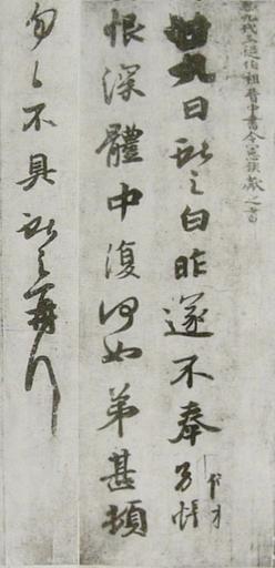Keywords: TwentyNinth Wang Xianzhi.JPG en Twenty Ninth day letter Replica of Calligraphy by Wang Xianzhi ACE 344-386 ink on paper 25cm height One part of the collected works handscroll of Wansui Tongtien Tie in Liaoning Province Museum China 廿 日帖 王献之の書 紙 墨書 高25cm 唐時代の模写 万歳 天 帖 巻子 に収録 遼寧 博物館 蔵 Wang family calligraphies copied in Tang dynasty Wen Mu Publishing Beijing 1962-07 唐模王羲之 書翰 1962年7 文物出版社 北京 Wang Xianzhi ACE 344-386 王献之 ACE 344-386 1962-07 PD-Art Chinese calligraphy Chinese cursive script |