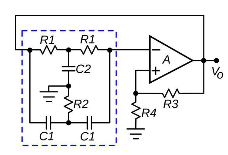 Keywords: Twin T oscillator.svg twin T oscillator a type of RC oscillator It is a feedback oscillator that produces a sinusoidal output The circuit in the blue box is a twin T filter; it is a notch filter which passes signals at all frequenies except at its notch frequency Positive feedback required to make the circuit oscillate is applied to the noninverting + input of the op-amp A through the voltage divider R3 and R4 However at all frequencies besides the notch frequency the twin T filter applies the same signal to the inverting - input so the loop gain is far below unity at those frequencies Only at the notch frequency is the loop gain above unity so the circuit oscillates at that frequency 2015-08-11 own Chetvorno other versions cc-zero Uploaded with UploadWizard Oscillator circuits |