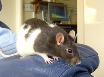Keywords: Twinkle Brown Hooded.JPG en A brown hooded rat show sitting on the arm of a leather chair own Own photo ELIOT2000 11/01/09 image may be freely used Pet rats