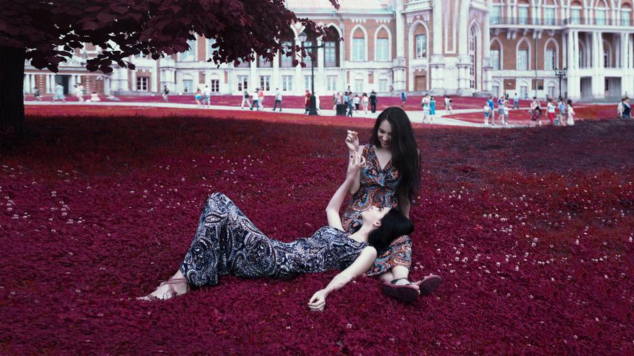 Keywords: twins girls sisters grass russia moscow beautiful book girl blue sky eyes glamour lie top view bright red mystical portrait of a girl photoshoot art makeup model hair facial expressions woman posture girl with flowers emotions