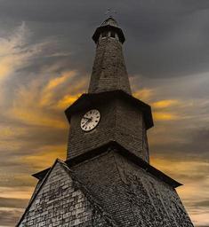 Keywords: twisted spire ancient spire church spire french spire church clock ancient tower wooden building architecture historical evening sky clouds landmark