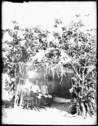 Photograph of two Acoma Indian men sitting on a wooden bench before the sacred kisi of San Esteban (Saint Stephan), Acoma Pueblo, 1886. The kisi is surrounded by large plants. Inside open entry of the kisi, there are several chairs. Some blankets hang on the wall. Both men wear long-sleeved shirts and pants. Part of another person sitting across from them is also visible.