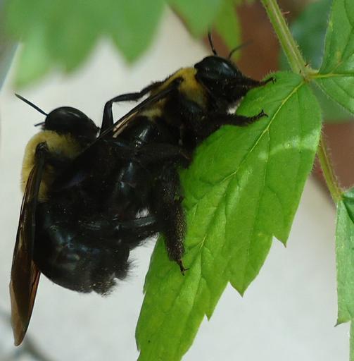 | Keywords: Two bees enjoying sexual intercourse.jpg en I was planting a red raspberry bush on my stoop when these two creatures appeared on a leaf I had thought that the Queen bee goes up in a spiral surrounded by drones but maybe an insect-ologist can explain this better In Summit New Jersey in April 2012 2012-04-14 own Tomwsulcer cc-zero Uploaded with UploadWizard Xylocopa virginica Hymenoptera sex | ||||