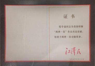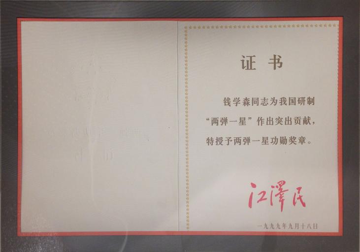 MAKE A MEME View Large Image Two Bombs and One Satellite Meritorious Award Certificate of Qian Xuesen.JPG zh-cn 1999年,钱学森获得中共中央 国务院和中央军委颁发的两弹 星功勋奖章 图为江泽民签署的证书原件,现藏上海交 ...