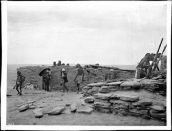 Photograph of two Hopi snake priests out at sunrise to hunt for ceremonial snakes on the first day of the Snake Dance Ceremony at the pueblo of Oraibi, Arizona, ca.1898. They wear skirts and moccasins. Another priest climbs a ladder which sticks out of the subterranean kiva at right. Two white men, one holding a parasol, look on to the right of center.