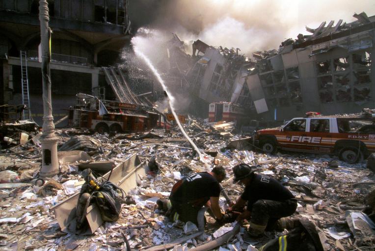 Keywords: outdoor Two New York City fire fighters spraying water on smoldering ruins following September 11th terrorist attack on World Trade Center, New York City. Sept. 11, 2001. Image. Retrieved from the Library of Congress, www.loc.gov/pictures/item/2002719367/. (Accessed September 03, 2016.) Call Number: LC-A05- E14 [item] [P&amp;P] Forms part of: Collection of unattributed photographs ... The 250 color slides made at the World Trade Towers in New York City on September 11, 2001, received from the New York District Attorney's office from an unattributed photographer, are in the public domain. Privacy and publicity rights may apply. These slides were received from the New York District Attorney's office with the photographer relinquishing any and all copyright and right of attribution. Therefore, the photographer's name will not be associated with these photographs. Note – This image has been digitally adjusted for one or more of the following: - fade correction, - color, contrast, and/or saturation enhancement - selected spot and/or scratch removal - cropped for composition and/or to accentuate subject matter - straighten image Two New York City fire fighters spraying water on smoldering ruins following September 11th terrorist attack on World Trade Center, New York City. Sept. 11, 2001. Image. Retrieved from the Library of Congress, www.loc.gov/pictures/item/2002719367/. (Accessed September 03, 2016.) Call Number: LC-A05- E14 [item] [P&P] Forms part of: Collection of unattributed photographs ... The 250 color slides made at the World Trade Towers in New York City on September 11, 2001, received from the New York District Attorney's office from an unattributed photographer, are in the public domain. Privacy and publicity rights may apply. These slides were received from the New York District Attorney's office with the photographer relinquishing any and all copyright and right of attribution. Therefore, the photographer's name will not be associated with these photographs. Note – This image has been digitally adjusted for one or more of the following: - fade correction, - color, contrast, and/or saturation enhancement - selected spot and/or scratch removal - cropped for composition and/or to accentuate subject matter - straighten image <em>Two New York City fire fighters spraying water on smoldering ruins following September 11th terrorist attack on World Trade Center, New York City</em>. Sept. 11, 2001. Image. Retrieved from the Library of Congress, <a href="http://www.loc.gov/pictures/item/2002719367/" rel="nofollow">www.loc.gov/pictures/item/2002719367/</a>. (Accessed September 03, 2016.)